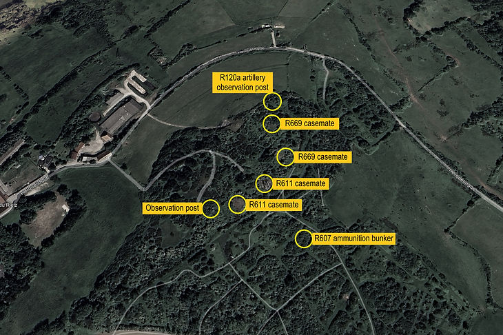 The R611 casemates are much larger and were designed for heavy calibre 15.5cm guns. These buildings featured a small crew room plus rooms for ammunition, and a rear defensive embrasure for a heavy machine gun. Today, both R611 casemates are in a poor state.